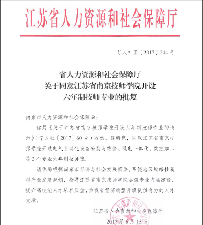 我院接到《省人力资源和社会保障厅关于同意江苏省南京技师学院开设六年制技师专业的批复》(苏人社函[2017]244号),同意开设电气自动化设备安装与维修、机电一体化、数控加工等3个专业。